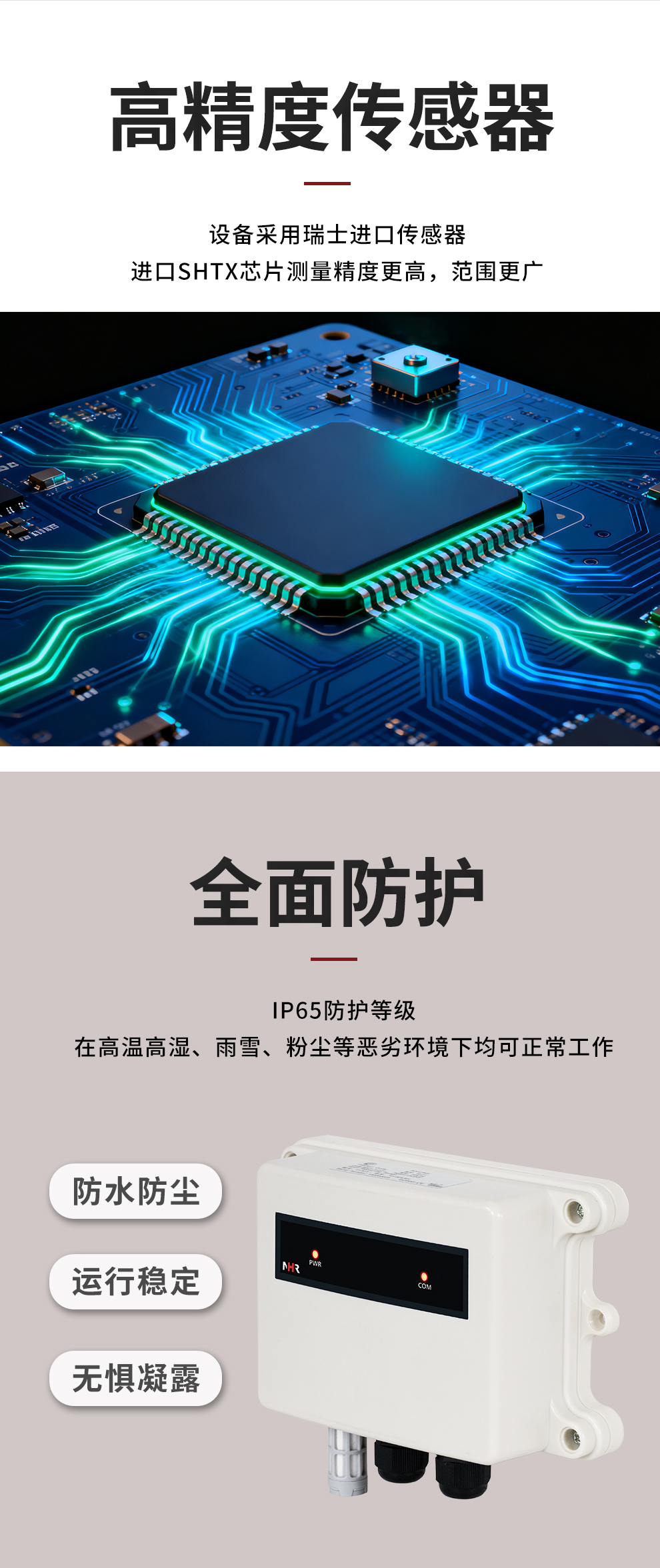 虹潤公司是專業(yè)生產(chǎn)環(huán)境監(jiān)測儀表的國家專精特新“小巨人”企業(yè)。生產(chǎn)的一體式溫濕度變送器,具有溫度、濕度、露點高精準的測量與變送,報警繼電器輸出,RS485/RS232通訊,IP65防護等級等特點。產(chǎn)品獲得一種手持式低功耗溫濕度檢測儀、大屏幕溫濕度記錄儀等2項國家發(fā)明專利,主持起草物聯(lián)網(wǎng)智能溫度儀表通用技術(shù)條件、冷鏈溫度記錄儀等2項國家標準,以及通信系統(tǒng)多通道數(shù)據(jù)采集控制終端規(guī)范軍用標準,以及現(xiàn)場設(shè)備集成等5項智能制造國家標準,參與國際5G標準制定,取得溫濕度儀表等3項相關(guān)軟件著作權(quán)。產(chǎn)品廣泛應(yīng)用于工業(yè)現(xiàn)場、農(nóng)業(yè)大棚、倉儲物流、地下管廊、養(yǎng)殖孵化、配電機房等諸多領(lǐng)域。