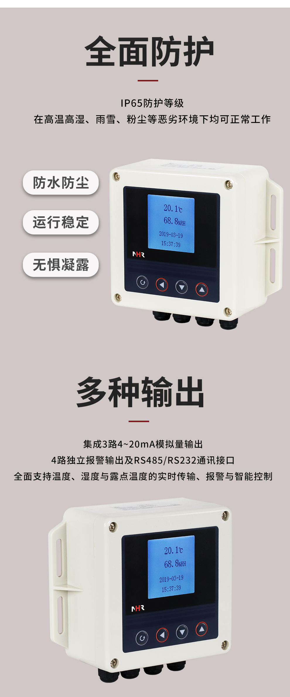 虹潤(rùn)公司是專(zhuān)業(yè)生產(chǎn)環(huán)境監(jiān)測(cè)儀表的國(guó)家專(zhuān)精特新“小巨人”企業(yè)。生產(chǎn)的壁掛式溫濕度控制器,具有溫度、濕度、露點(diǎn)高精準(zhǔn)的測(cè)量,多種輸出類(lèi)型,穩(wěn)定性強(qiáng),RS485/RS232通訊,IP65防護(hù)等級(jí)等特點(diǎn)。產(chǎn)品獲得一種手持式低功耗溫濕度檢測(cè)儀、大屏幕溫濕度記錄儀等2項(xiàng)國(guó)家發(fā)明專(zhuān)利,主持起草物聯(lián)網(wǎng)智能溫度儀表通用技術(shù)條件、冷鏈溫度記錄儀等2項(xiàng)國(guó)家標(biāo)準(zhǔn),通信系統(tǒng)多通道數(shù)據(jù)采集控制終端規(guī)范軍用標(biāo)準(zhǔn),以及現(xiàn)場(chǎng)設(shè)備集成等5項(xiàng)智能制造國(guó)家標(biāo)準(zhǔn),參與國(guó)際5G標(biāo)準(zhǔn)制定,取得溫濕度儀表等2項(xiàng)相關(guān)軟件著作權(quán)。產(chǎn)品廣泛應(yīng)用于工業(yè)現(xiàn)場(chǎng)、農(nóng)業(yè)大棚、倉(cāng)儲(chǔ)物流、地下管廊、養(yǎng)殖孵化、配電機(jī)房等諸多領(lǐng)域。