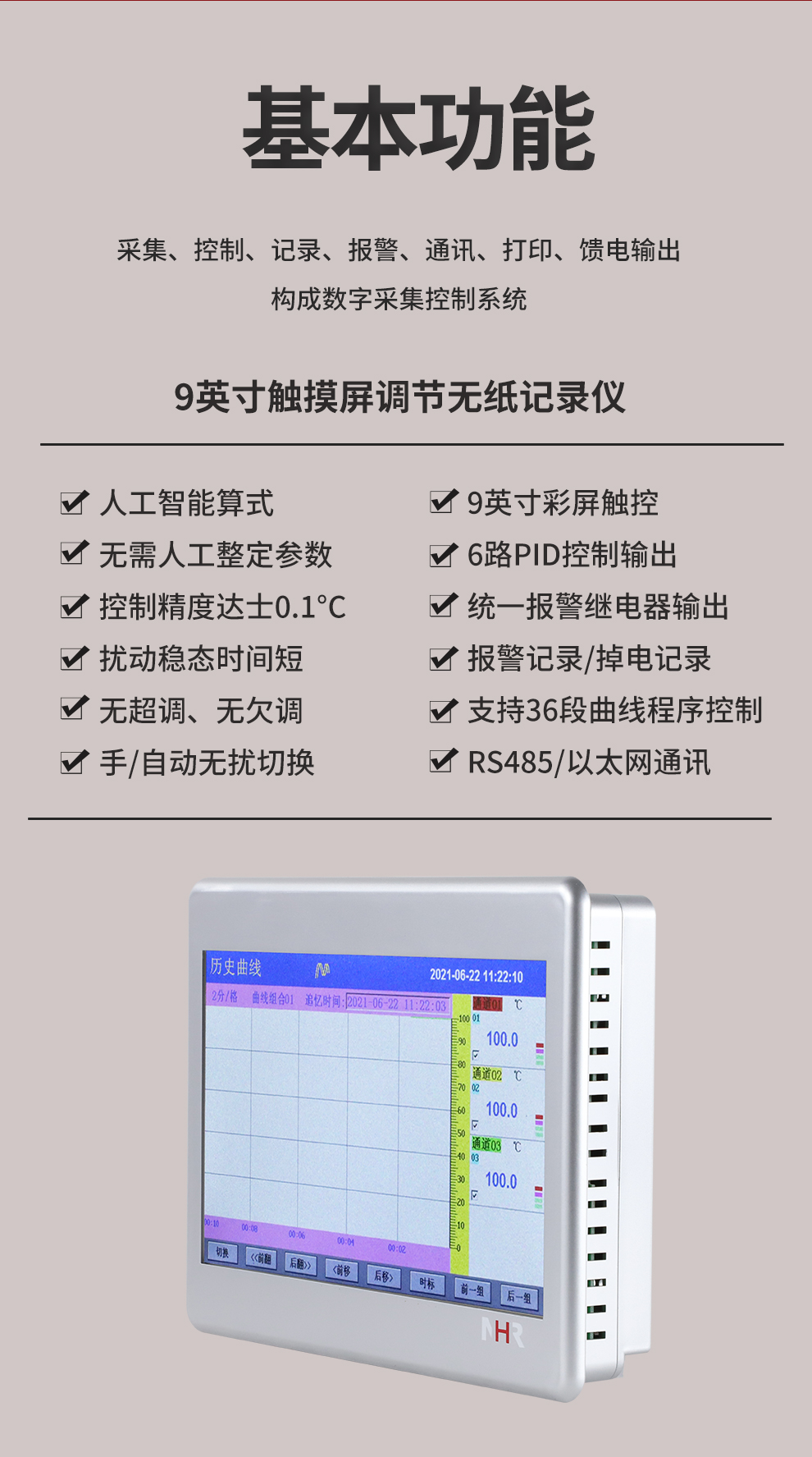 虹潤公司是專業(yè)生產(chǎn)無紙記錄儀的國家專精特新“小巨人”企業(yè)。生產(chǎn)的觸摸屏調(diào)節(jié)無紙記錄儀,具有觸摸大屏顯示,真正人工智能算式,無需人工整定參數(shù),控制精度達士0.1°C,數(shù)據(jù)記錄與轉(zhuǎn)存, RS485/以太網(wǎng)通訊,5/7/9英寸可選等特點。產(chǎn)品獲得智能化控制器、人工智能調(diào)節(jié)器及調(diào)節(jié)方法、模糊PID控制儀及控制方法、平板無紙記錄儀、巡回檢測顯示方法及裝置等5項國家發(fā)明專利,主持起草物聯(lián)網(wǎng)智能記錄儀表通用技術(shù)條件、物聯(lián)網(wǎng)智能溫度儀表通用技術(shù)條件、工業(yè)過程測量和控制系統(tǒng)用智能調(diào)節(jié)器等3項國家標準,通信系統(tǒng)多通道數(shù)據(jù)采集控制終端規(guī)范軍用標準,以及空間數(shù)據(jù)與信息數(shù)據(jù)傳輸系統(tǒng)等2項航天標準,參與國際5G標準制定,取得觸摸屏彩色調(diào)節(jié)無紙記錄儀等3項相關(guān)軟件著作權(quán)。產(chǎn)品廣泛應(yīng)用于電力、石化、冶金、化工、食品、制藥、熱處理、水處理、機械配套等諸多領(lǐng)域。