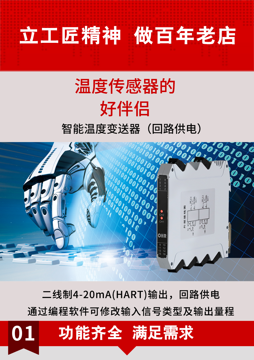 虹潤(rùn)公司是專業(yè)生產(chǎn)溫度變送器的國(guó)家專精特新“小巨人”企業(yè)。生產(chǎn)的HART智能溫度變送器,具有適配各類溫度傳感器,通過(guò)編程線修改輸入信號(hào)類型及量程,二線制4-20Ma(HART)輸出,回路供電等特點(diǎn)。該產(chǎn)品不僅通過(guò)HART基金會(huì)認(rèn)證、德國(guó)萊茵 CE 認(rèn)證與 SIL 功能安全認(rèn)證,還獲得具備減震抗干擾能力的溫度變送器、信號(hào)隔離器、一種二端子模塊、無(wú)源信號(hào)隔離器等4項(xiàng)國(guó)家發(fā)明專利,主持起草物聯(lián)網(wǎng)智能溫度儀表、現(xiàn)場(chǎng)設(shè)備工具(FDT)接口規(guī)范、工業(yè)過(guò)程測(cè)量和控制系統(tǒng)用溫度變送器等3項(xiàng)國(guó)家標(biāo)準(zhǔn),以及通信系統(tǒng)多通道數(shù)據(jù)采集控制終端規(guī)范軍用標(biāo)準(zhǔn),參與國(guó)際5G標(biāo)準(zhǔn)制定,取得HART溫度變送器、智能溫度變送器等5項(xiàng)相關(guān)軟件著作權(quán)。產(chǎn)品廣泛應(yīng)用于石油、化工、電力、冶金、制藥、食品、水處理等各種工業(yè)領(lǐng)域。