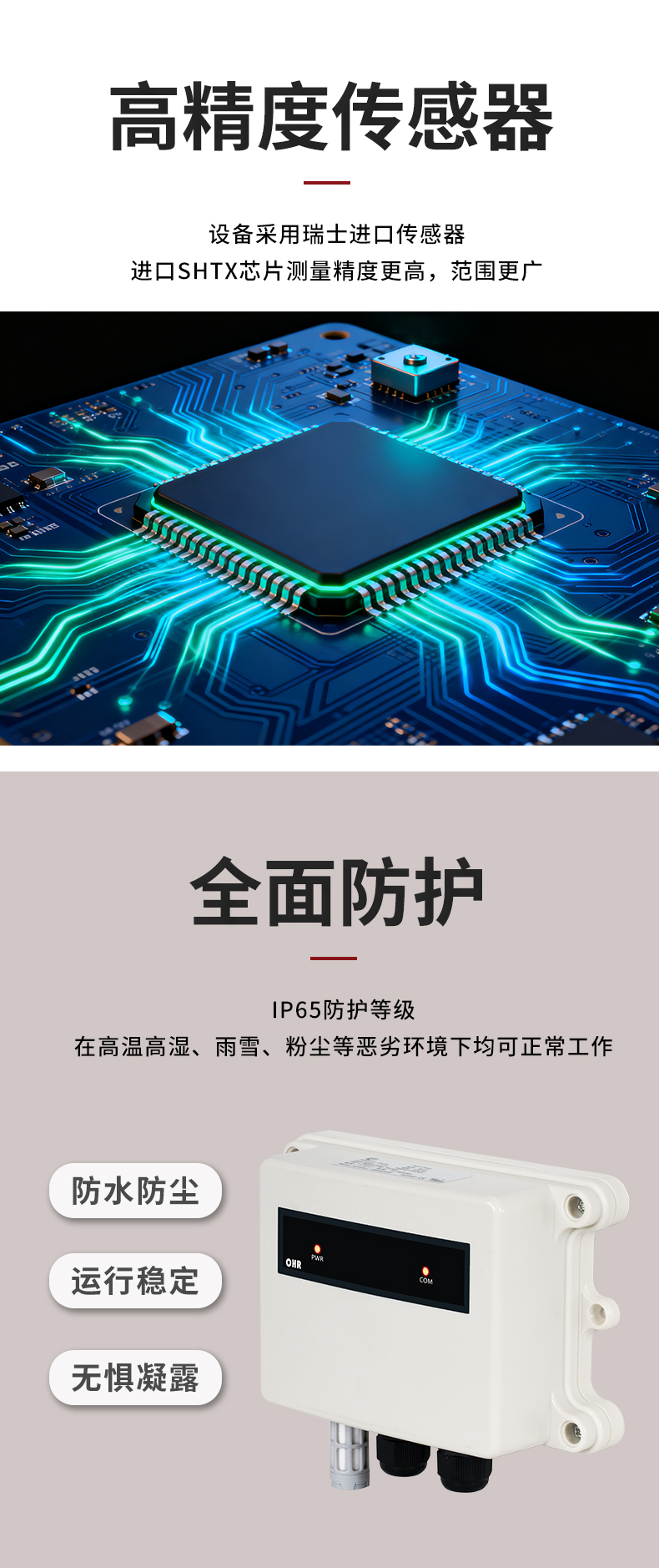 虹潤公司是專業(yè)生產(chǎn)環(huán)境監(jiān)測儀表的國家專精特新“小巨人”企業(yè)。生產(chǎn)的一體式溫濕度變送器,具有溫度、濕度、露點高精準的測量與變送,報警繼電器輸出,RS485/RS232通訊,IP65防護等級等特點。產(chǎn)品獲得一種手持式低功耗溫濕度檢測儀、大屏幕溫濕度記錄儀等2項國家發(fā)明專利,主持起草物聯(lián)網(wǎng)智能溫度儀表通用技術(shù)條件、冷鏈溫度記錄儀等2項國家標準,以及通信系統(tǒng)多通道數(shù)據(jù)采集控制終端規(guī)范軍用標準,以及現(xiàn)場設備集成等5項智能制造國家標準,參與國際5G標準制定,取得溫濕度儀表等3項相關(guān)軟件著作權(quán)。產(chǎn)品廣泛應用于工業(yè)現(xiàn)場、農(nóng)業(yè)大棚、倉儲物流、地下管廊、養(yǎng)殖孵化、配電機房等諸多領(lǐng)域。