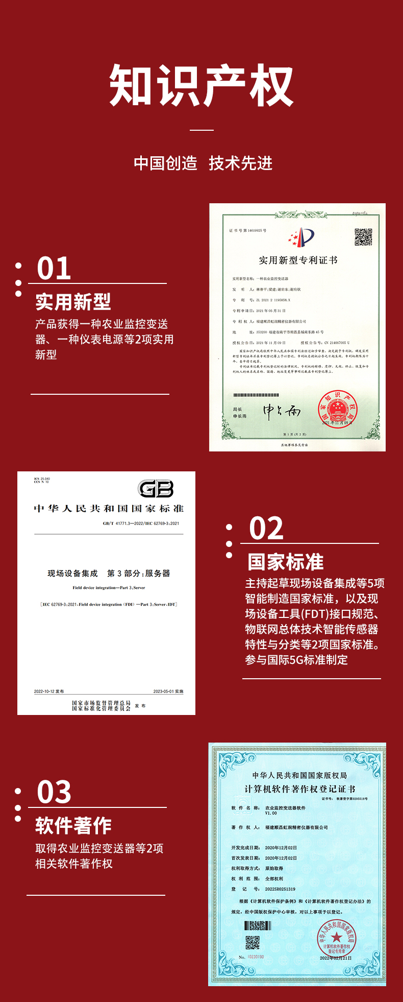虹潤公司是專業(yè)生產(chǎn)環(huán)境監(jiān)測儀表的國家專精特新“小巨人”企業(yè)。生產(chǎn)的二氧化碳變送器,具有新型紅外檢定技術,自動溫度補償,響應靈敏,低功耗,模擬量變送輸出或RS485通訊等特點。產(chǎn)品獲得一種農(nóng)業(yè)監(jiān)控變送器、一種儀表電源等2項實用新型專利,主持起草現(xiàn)場設備集成等5項智能制造國家標準,以及現(xiàn)場設備工具(FDT)接口規(guī)范、物聯(lián)網(wǎng)總體技術智能傳感器特性與分類等2項國家標準,參與國際5G標準制定,取得農(nóng)業(yè)監(jiān)測變送器等3項相關軟件著作權。產(chǎn)品廣泛應用于機房、配電站、地下車庫、工廠倉庫、食品儲存、養(yǎng)殖場、果蔬林園等環(huán)境場合對二氧化碳濃度的檢測。