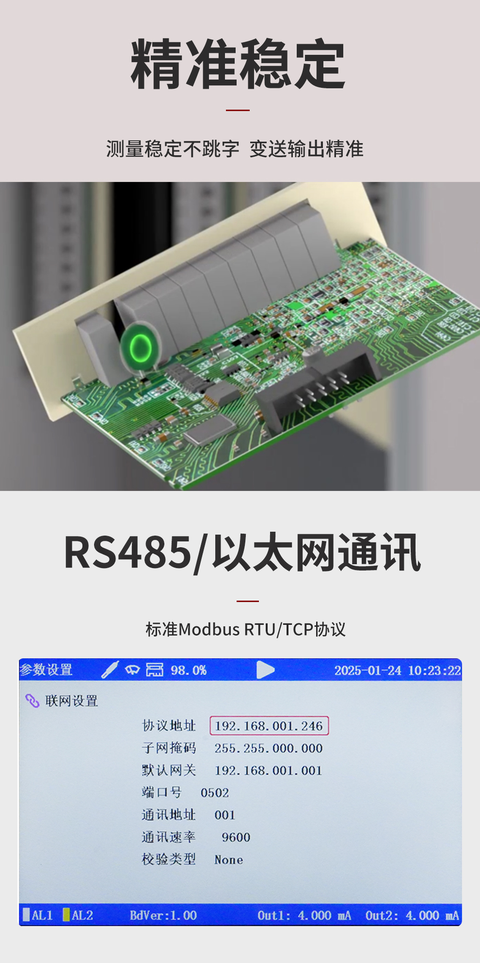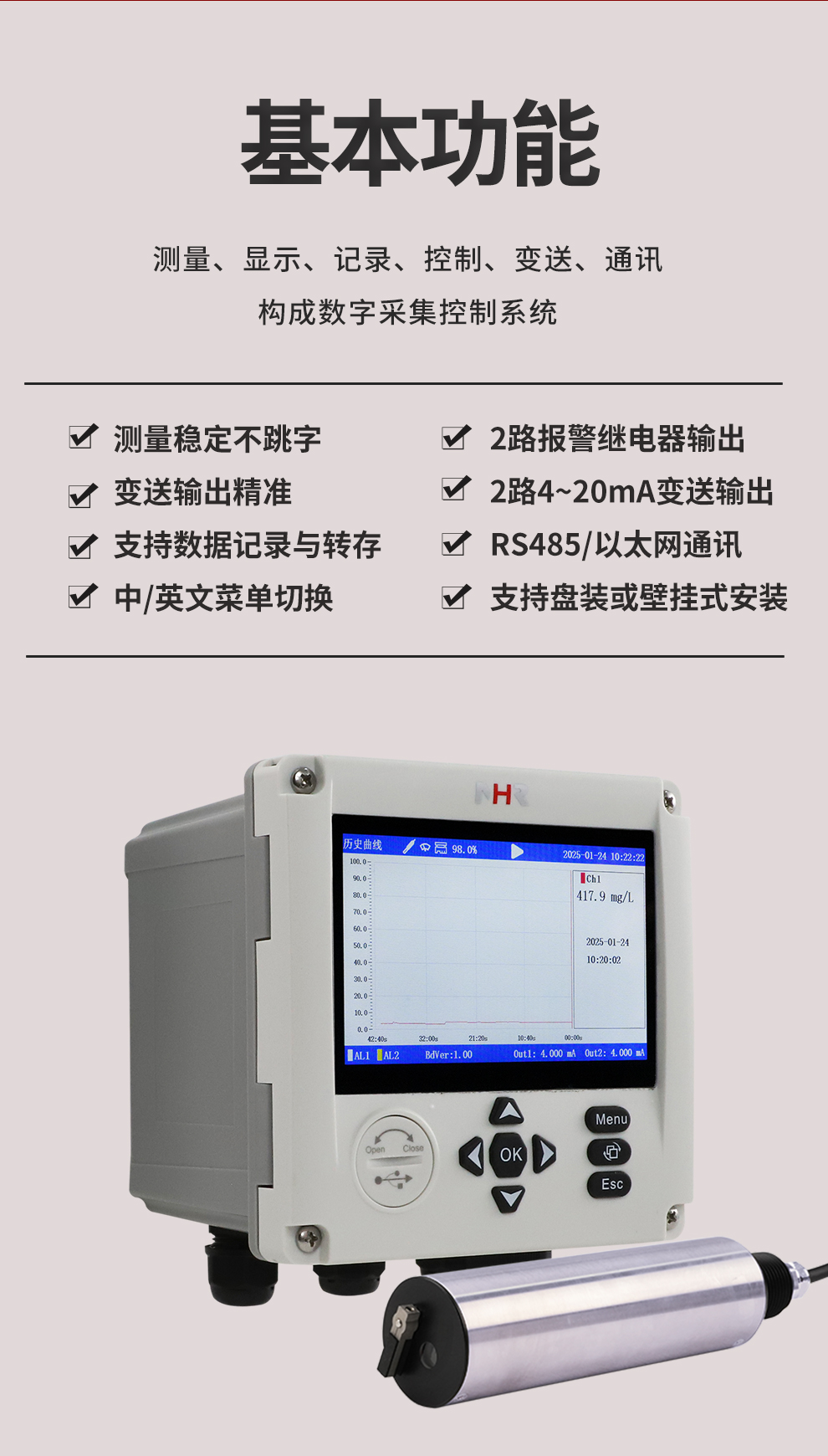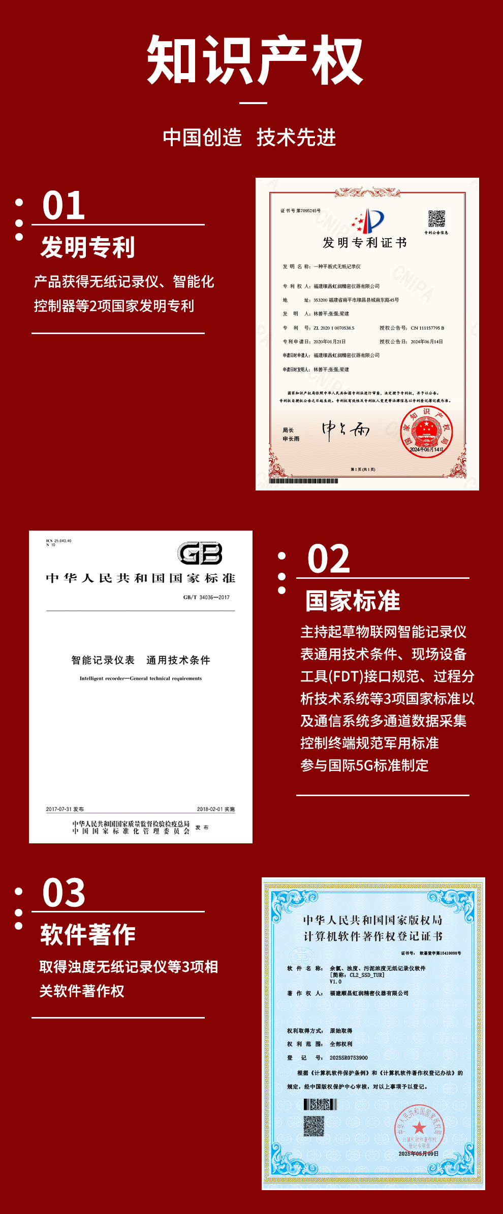 虹潤(rùn)公司是專業(yè)生產(chǎn)水質(zhì)分析儀的國(guó)家專精特新“小巨人”企業(yè)。生產(chǎn)的濁度/污泥記錄儀,具有彩色大屏顯示,測(cè)量精準(zhǔn)穩(wěn)定不跳字,數(shù)據(jù)記錄與轉(zhuǎn)存,RS485/以太網(wǎng)通訊,配套上位機(jī)管理軟件等特點(diǎn)。產(chǎn)品獲得一種平板無(wú)紙記錄儀、智能化控制器等2項(xiàng)國(guó)家發(fā)明專利;主持起草物聯(lián)網(wǎng)智能記錄儀表通用技術(shù)條件、現(xiàn)場(chǎng)設(shè)備工具(FDT)接口規(guī)范.、過(guò)程分析技術(shù)系統(tǒng)等3項(xiàng)國(guó)家標(biāo)準(zhǔn),以及通信系統(tǒng)多通道數(shù)據(jù)采集控制終端規(guī)范軍用標(biāo)準(zhǔn),參與國(guó)際5G標(biāo)準(zhǔn)制定;取得濁度、污泥濃度無(wú)紙記錄儀等3項(xiàng)相關(guān)軟件著作權(quán)。產(chǎn)品廣泛應(yīng)用于市政供水、污水處理、食品、制藥、造紙、石化、冶金、水處養(yǎng)殖等諸多領(lǐng)域。