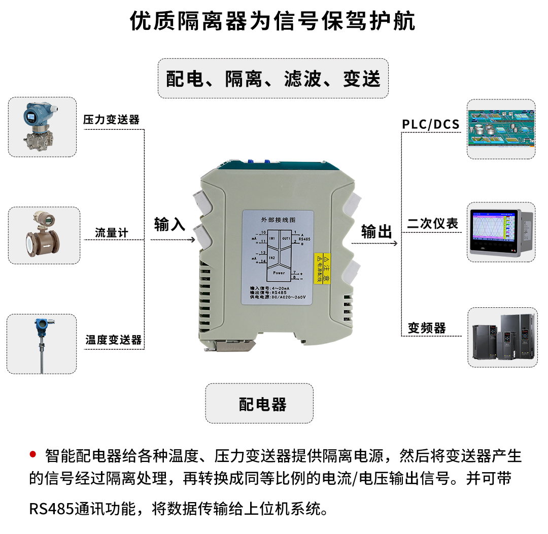 虹潤公司是專業(yè)生產(chǎn)隔離器的國家專精特新“小巨人”企業(yè)。生產(chǎn)的導(dǎo)軌式智能配電器,具有配接二三線制變送器,輸入輸出電源三隔離,響應(yīng)時間快,傳輸精度0.1%FS,支持485通訊輸出等特點。產(chǎn)品獲得信號隔離器、一種二端子模塊、無源信號隔離器等3項國家發(fā)明專利,主持起草現(xiàn)場設(shè)備工具(FDT)接口規(guī)范、工業(yè)過程測量和控制系統(tǒng)用隔離式安全柵、工業(yè)過程測量和控制系統(tǒng)用配電器等3項國家標準,以及通信系統(tǒng)多通道數(shù)據(jù)采集控制終端規(guī)范軍用標準。參與國際5G標準制定。,取得智能隔離器等2項相關(guān)軟件著作權(quán)。產(chǎn)品廣泛應(yīng)用于石油、化工,冶金、電力、食品、光伏能源、污水處理等需要電隔離的工業(yè)自動化控制系統(tǒng)。