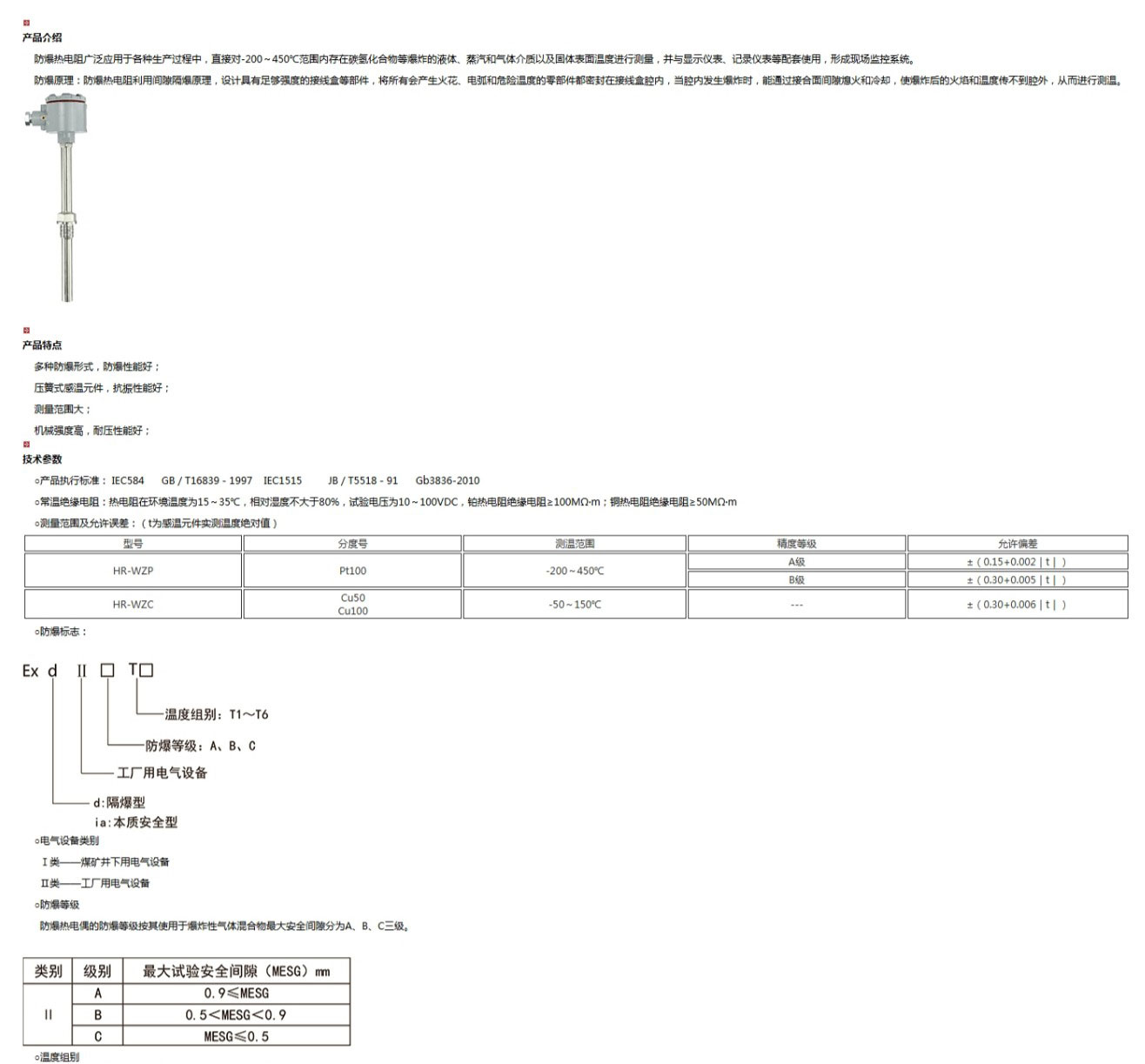 防爆熱電阻廣泛應(yīng)用于各種生產(chǎn)過程中,直接對-200~450℃范圍內(nèi)存在碳氫化合物等爆炸的液體、蒸汽和氣體介質(zhì)以及固體表面溫度進行測量,并與顯示儀表、記錄儀表等配套使用,形成現(xiàn)場監(jiān)控系統(tǒng)。