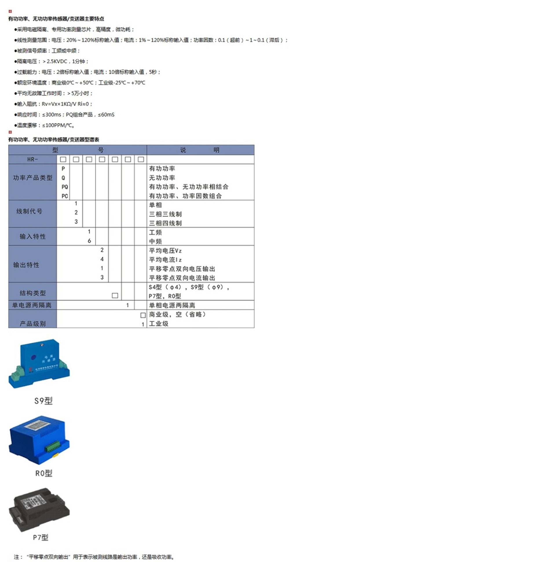 有功功率、無功功率傳感器/變送器是一種將電網(wǎng)中的有功功率/無功功率隔離變送成線性的直流模擬信號的裝置。該產(chǎn)品采用電磁隔離、專用功率測量芯片,高精度,微功耗。